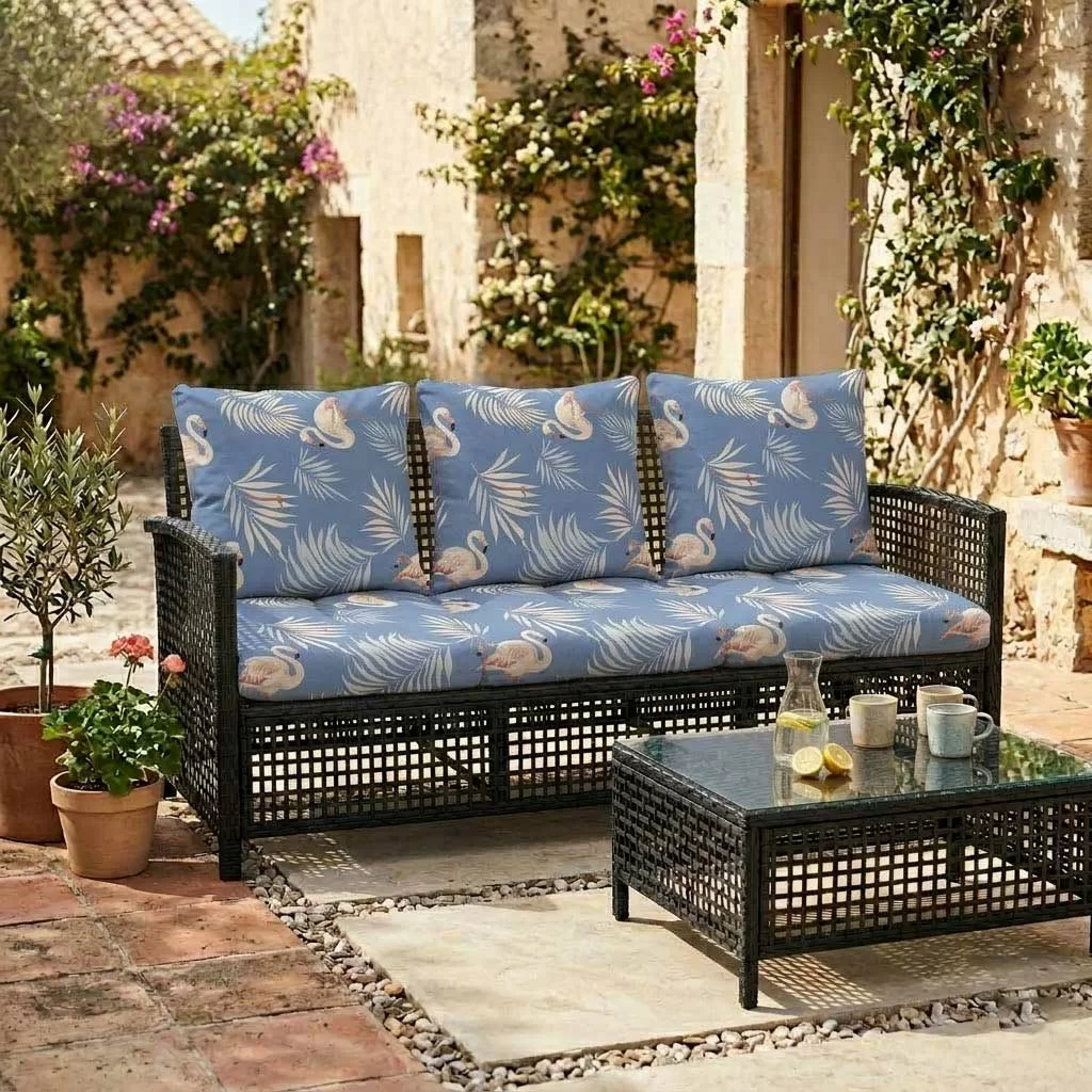 Vaš baštenski trosed biće savršen letnji kutak za odmor sa porodicom ili prijateljima uz komplet mekih jastuka, sedalni i tri za naslon, dimenzija 160x50x50cm, debljine 15-20cm, od glatkog pamuka.