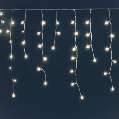 Moderne novogodišnje lampice ukupne dužine niza 490cm. opremljene sa 50 mikro LED dioda smeštenih u oblik zaledjene kapljice. Napajanje sa 3 beterije...